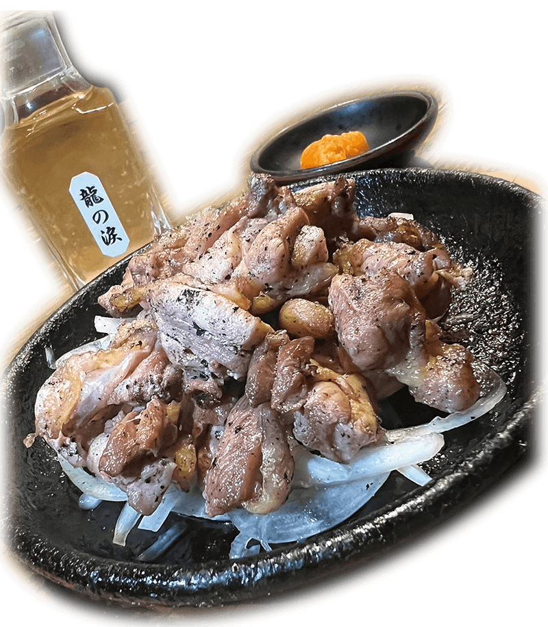 新鮮な旨味の淡路鶏を特製味噌で一気に焼き上げ、仕上げに「龍の涙」でキマリ!
