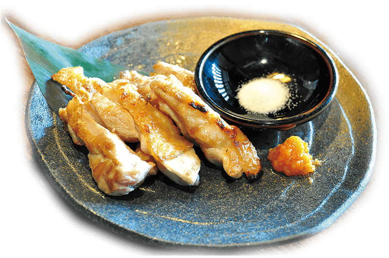 柔らかく旨味の若もも肉を炭火で一気に焼き上げ、赤穂の塩と、香りと辛味の完熟柚子胡椒で!